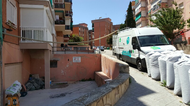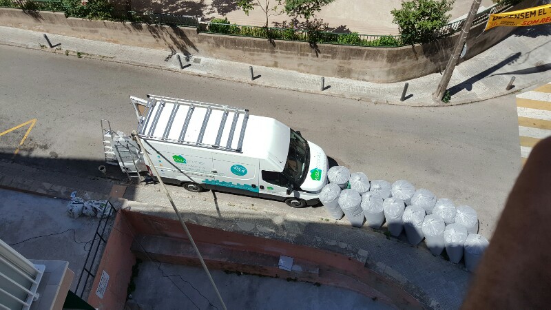 Con el equipo de insuflado de Aislaecotres rellenamos las cámaras de la fachada posterior en un sólo día y sin obras. Durante la instalación constatamos que en la medianera había también un tabique hueco y aprovechamos para insuflarlo y mejorar el aislamiento acústico con corcho de alcornoque.